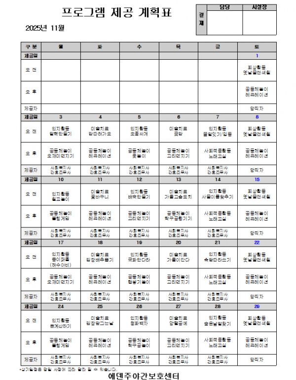 11월프로그램계획표 페이지 정보 작성자 에덴데이케어 작성일25-11-15 16:01 조회7회 댓글0건 관련링크 다음글 목록 본문 11월 프로그램 계획표입니다. 댓글목록 등록된 댓글이 없습니다. 다음글 목록